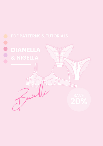 Expertly crafted PDF sewing patterns for Dianella full coverage bra and Nigella Brazilian cheeky panty, available for instant digital download.